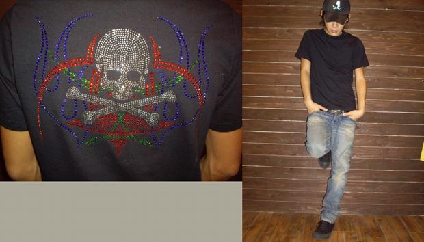 バックにはおなじのスカルにここではレインボーのラインストーンがスカルの回りにちりばめられていてとてもインパクトあるTシャツです!
