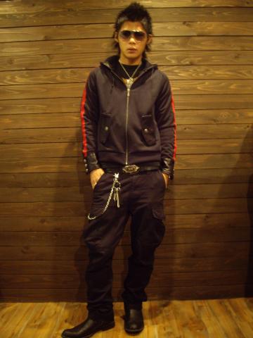 このアイテムは、裏毛スウェット生地の黒いジャージに発色にいいカラーで切替し加工をし、胸にメキシカン風のスカル、ポケットには、ヒッピー風のスカルを刺繍してあります!!結構タイトな作りですが、生地がスウェット生地なので動きやすく、形もジャージなのでスポーティーですね!!