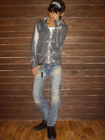 この商品はひげ染め。タテにひげじわのようなムラが出る技法を全体に散りばめた雰囲気のあるZIPパーカーです!そこにクロスのプリントでさらに引き立てたポイントの高いアイテムです!!メンズディガー掲載ブランド