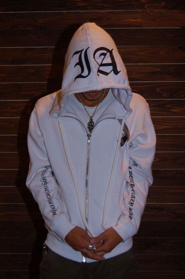 オリジナルワッペン付きジップアップパーカー!ホワイトボディに絶妙に配置されたプリントがまじクール
